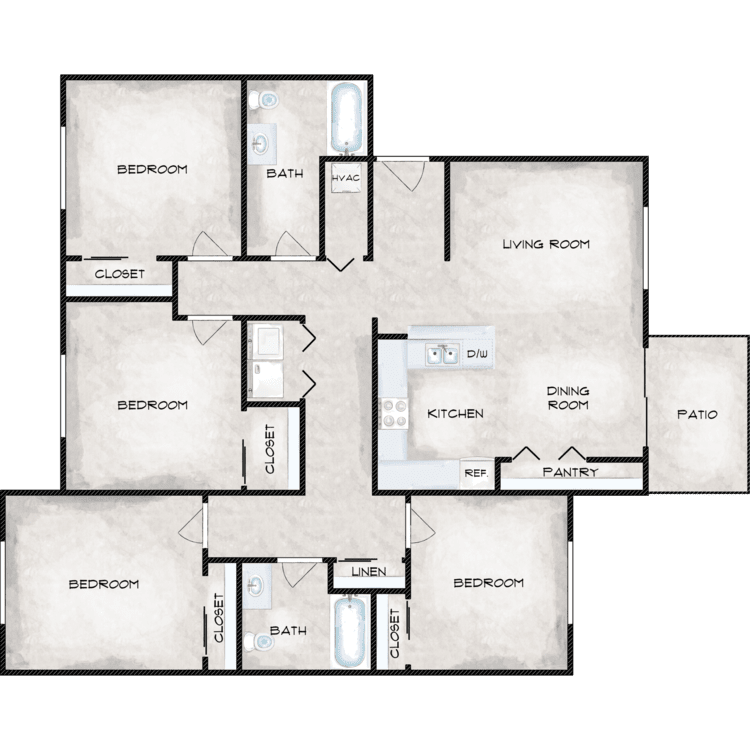 Our spacious, open-concept two, three, and four-bedroom apartments for rent boast fully equipped kitchens with dishwashers, refrigerators, and microwaves. Relax after a long day on your balcony or patio while doing your laundry in the in-home washer and dryer. Our community provides some paid utilities, such as water, sewer, and gas. Enjoy high-quality living without the high price; every apartment is designed to be both comfortable and affordable.